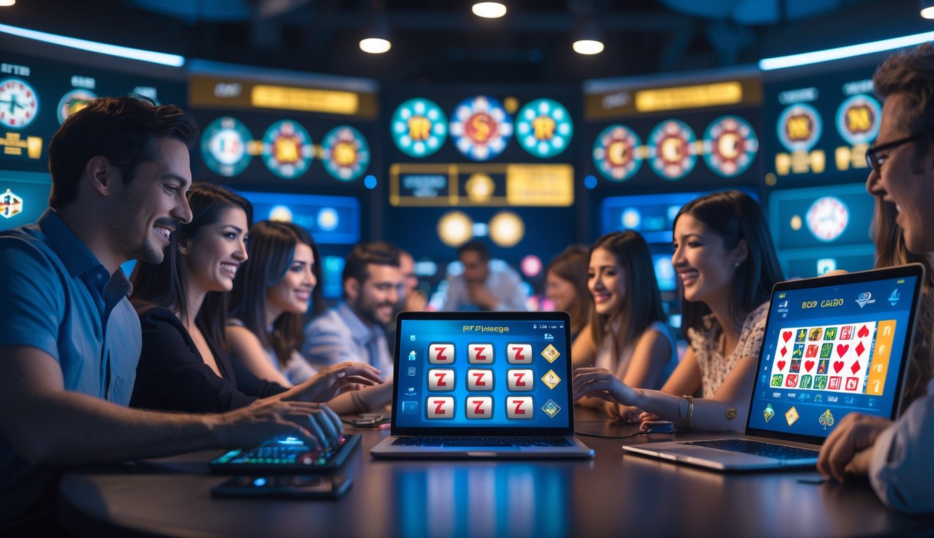 Sekelompok orang bermain permainan kasino online secara langsung menggunakan laptop dan ponsel di ruangan modern dengan layar menampilkan permainan kasino.
