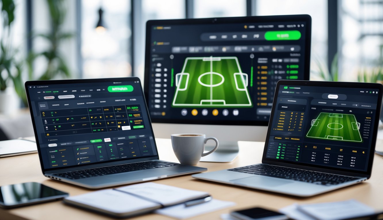 Orang menggunakan beberapa perangkat digital untuk melihat peluang taruhan sepak bola secara online dengan pembaruan cepat.